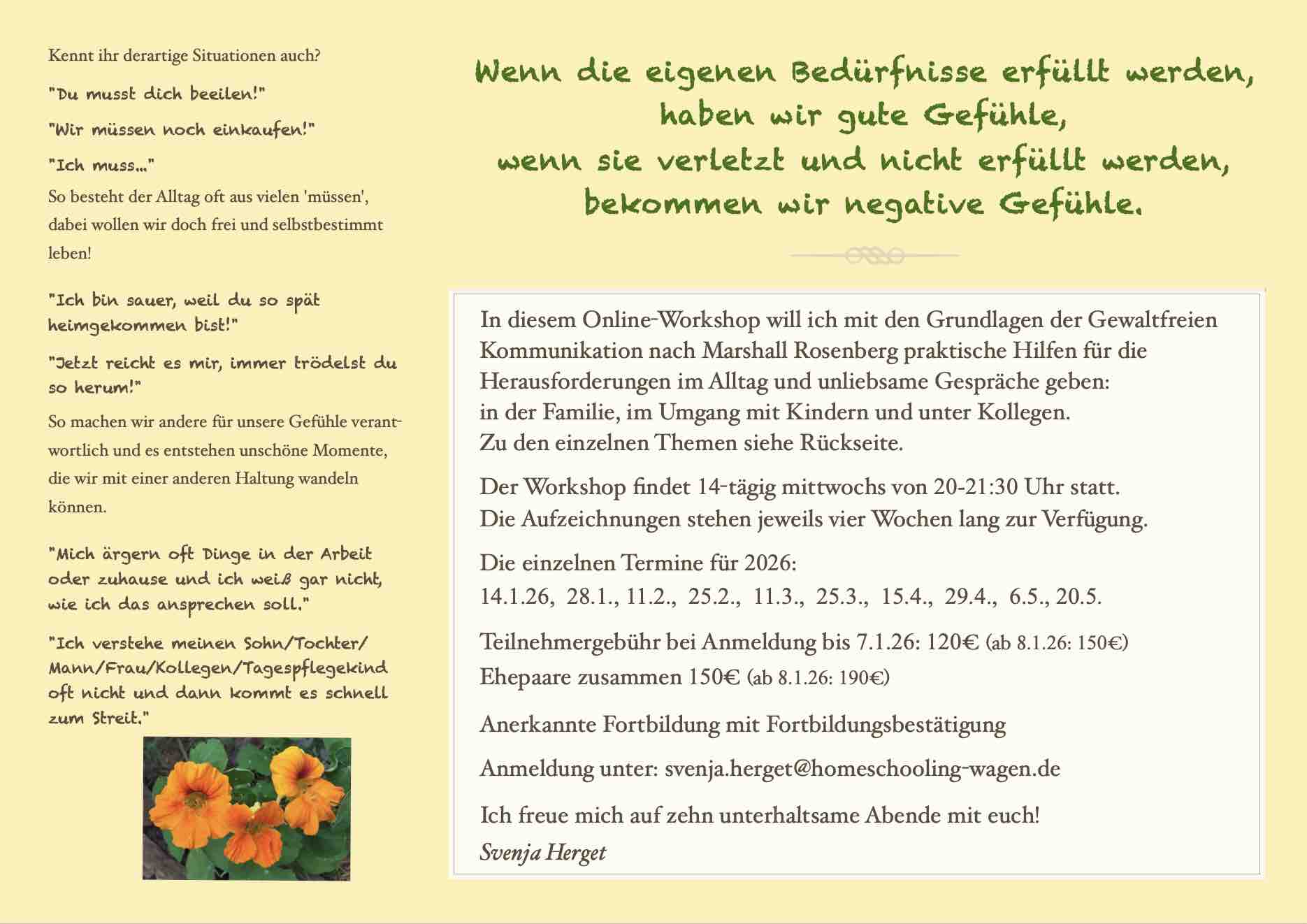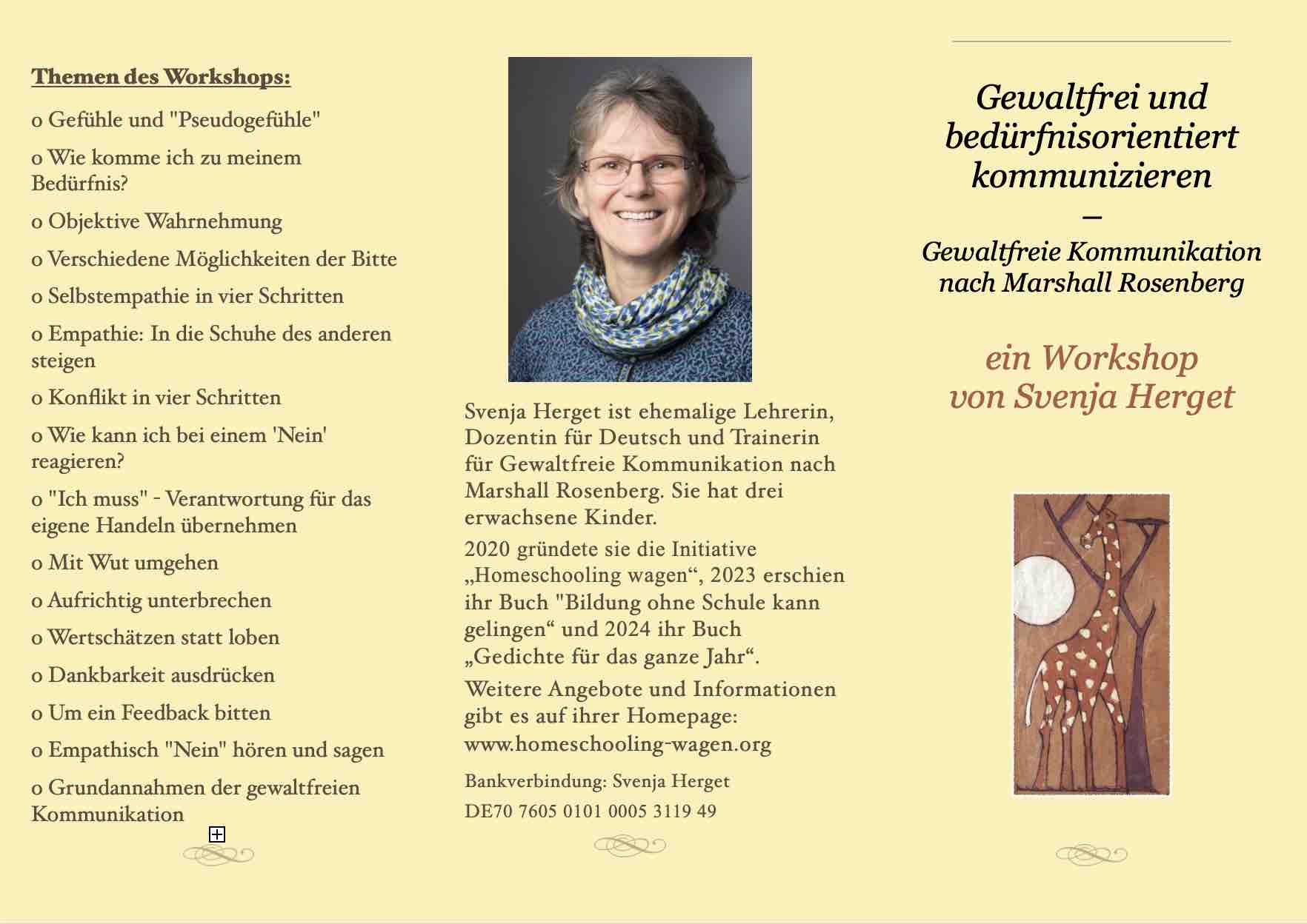 „Gewaltfrei und bedürfnisorientiert kommunizieren“ als Fortbildung – Wer obigen Flyer gern – z.B. für seinen Arbeitgeber – ausgedruckt haben möchte, schreibe mir gern eine Mail mit seiner Adresse